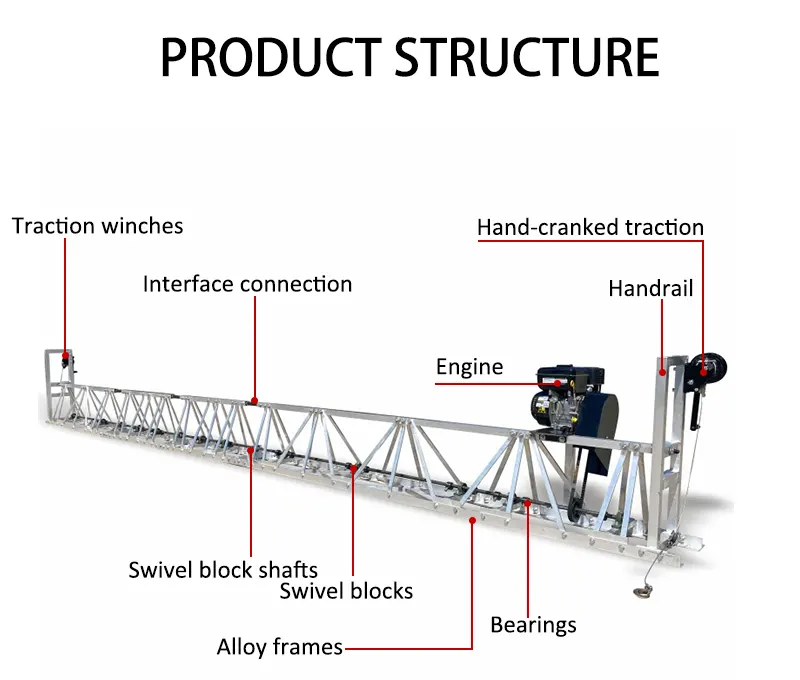 18 -metrowy betonowa aluminiowa wibrująca maszyna do wyrównania ramy jest maszyną do poziomu ramy o jednolitym prędkości, stabilnej wydajności i regulowanej długości.
